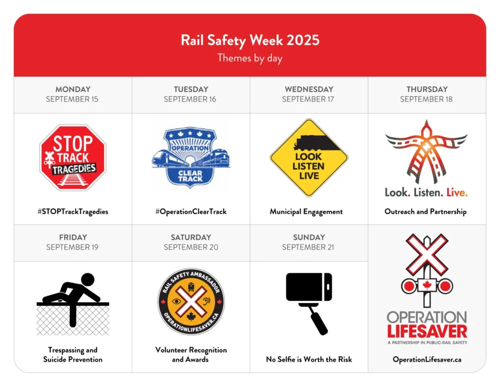Chaque année, Opération Gareautrain Canada organise la Semaine de la sécurité ferroviaire afin de sensibiliser la population et de sauver des vies. En 2025, nous invitons les Canadiens à se joindre à nous pour diffuser ce message.